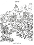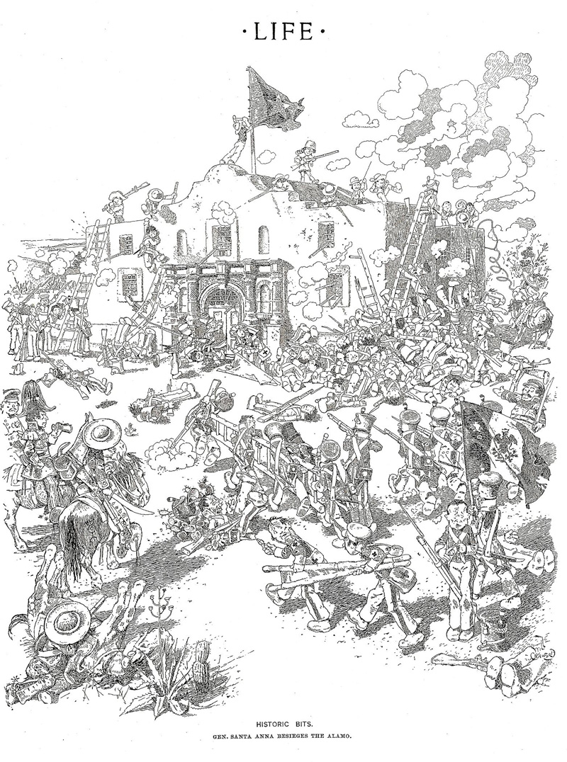 Butler clearly knew a good thing when he saw it: he picked top cartooning talent to illustrate his books. Like many artists of his generation, Crawford was more illustrator than cartoonist although he displayed throughout his career a flair for humor. Born in 1869 in Washington, D.C., he began drawing for the Newark Call in New Jersey while still a teenager. Later, he joined the staff of the New York World, and he also drew for Puck (“pungent political cartoons” according to Walt Reed in The Illustrator in America), Munsey’s and St. Nicholas, a magazine for youth. Crawford went West for a time and became something of an authority on the frontier. He was also a good friend of Charlie Russell, the famed cowboy painter of Montana: “It is apparent that Russell improved his own pen-and-ink technique through Crawford’s example,” Reed writes. Crawford had an intricate manner with a pen that is unmatched in delicacy of texture and shading. For the old Life humor magazine, he did a series of “Historic Bits” that are unrivaled in his day for detail.