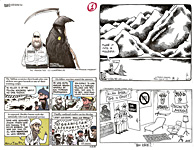 THE BIG NEWS OF THE LAST FEW WEEKS goes from the terrifying to the ridiculous, as usual. The terrifying part took place at Fort Hood. Reports throughout the misnomered news media immediately identified the perpetrator as a Muslim thereby betraying a bias too frequently indulged in these paranoid times. What religion is the guy who killed the abortion provider in Kansas? The shooter at Virginia Tech? Or what about the Florida man who, on the same day as the Fort Hood tragedy was transpiring, lost his cool completely and shot up his former workplace? But few, if any, editoonists took this tack; most deployed heavy sarcasm to indict the military for failing to contain or detain mass murderer Nidal Hasan. In our first exhibit of cartoons, we have Michael Ramirez at the upper left blaming political correctness with a menacing metaphor, but it doesn’t seem to work, quite: if Political Correctness, the “unindicted co-conspirator,” is also Death, as the image suggests, how, exactly, does Political Correctness equal Death? Moreover, no matter how convenient an umbrella “Political Correctness” is for a multitude of sins, it isn’t an entirely accurate explanation for what happened with Hasan. Army authorities were reluctant to conclude that Hasan was dangerous based solely on circumstantial evidence, however high it got piled up, but I’d say that was another American trait being exercised, the one that claims one is innocent until proven guilty. Misplaced sense of justice in this instance, but probably the operative attitude. Next, moving in a counter-clockwise direction, we find Ted Rall (lower left) turning the issue on its head, as he often does, and delivering a snide comment on our propensity to find Islamic extremism lurking in Hasan’s rampage. The message—patriotism isn’t necessarily the answer—is not immediately apparent: if Sheikh Osama is acting in the third panel like Baracko Bama did, then who is the equivalent of Mullah Omar? But a limping conclusion still leaves the rest of the strip a telling indictment. In the next cartoon, Tony Auth takes sarcasm to its obvious extremity; telling imagery and, by itself, not necessarily an attack on Islam. Pundits clogged the airways with endless discussions of whether Hasan was a terrorist or not, everyone offering a different definition of “terrorist.” The only objective I can detect in defining Hasan as a terrorist is to determine what kind of court he should be tried in—civilian or military. And even judicious judgement, thanks to Attorney General Eric Holder’s decision to try five Guantanamo detainees in civilian court in New York, doesn’t seem to lead to an unequivocal outcome. Civilian courts, as the National Review Online pointed out, are for trying people accused of crimes, but terrorism isn’t a crime: it’s an act of war, and those accused of terrorism should therefore be tried in miliary courts. In the case of the Gitmo five, Glenn Greenwald at Salon.com argues that none of them are likely to ever walk free again, even if they were to be acquitted. “The honest approach,” he concludes, “would be to announce that dangerous defendants such as these will be held indefinitely as prisoners of war, under the rules established by international law.” Hasan, however, doesn’t seem to me to be a terrorist. I agree with James Fox at USA Today, who allows that Hasan may have seen his grievances through an Islamic prism, but he closely fits the profile of a typical workplace killer. Like most of the lonely, middle-aged men who show up at work one day and open fire, Hasan had recently suffered “profound episodes of failure” ... [and he] appeared to be “seeking vengeance for personal mistreatment,” even singling out certain co-workers to be shot. Is personal revenge truly terrorism? I don’t think so. Hasan is just a nutcase with a gun. He committed murder, not terror. Moreover, as Robert Kaplan said in TheAtlanticOnline.com, “By insisting that Hasan’s rampage was an act of jihad (holy war), we turn the mass shooting into a military victory for al-Qaida [and] feed into the narrative that the U.S. is at war with all Muslims,” discouraging those who live in America who might enlist in the military at a time when “our military is desperately short of soldiers who understand both Islamic culture and languages”—the kind of recruit we sorely need in the struggle at hand. Our last cartoon on the first exhibit is Tom Toles’ vivid image for a new approach to Afghanistan, one of the other preoccupations of the news media in recent weeks. By the way (although not at all incidentally), the best definition of victory in Iraq and Afghanistan is what I heard a week or so ago on “60 Minutes” from the lips of an American soldier who said: “Going home alive—that’s victory in Afghanistan.” Our next exhibit (2) of recent editoons of notable potency begins, upper left, with Brian Duffy’s ingenious image of the Grand Old Pachyderm’s much acclaimed “victory” in two state elections where GOP candidates won governorships, a celebration that conveniently overlooked the Republican loss in a historically conservative district in New York. Moving clockwise, we encounter another clever visual contrivance by Chuck Asay whose cartoon about unemployment reveals the source of the helping hand (in the background, the taxpayer’s hand is being lopped off) while also indicting the press for inadvertent deception in reporting on the issue. Pat Bagley gives us the next two lessons in civics. His comment on the GOP health care plan is fairly accurate, as far as I have been able to determine; and while the words alone convey the message, the picture of the supplicating family adds poignancy and therefore power to the comment. The much-heralded debate that is either going on in the Senate or has, by the time this gets posted, terminated is not, probably, a “debate.” A debate is where two people with oppos