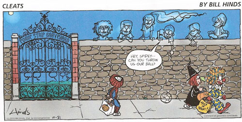HANGS UP CLEATS That's quite different from the “crazy slapstick” in Hinds’ strip for Sports Illustrated, Buzz Beamer, and from Jeff Millar's satirical writing in Tank McNamara. “Speaking of Tank,” Hinds said, “some people couldn't seem to separate Cleats from Tank. The term Tank Lite came up a few times online, and the Cleats writing was occasionally attributed to the innocent Jeff Millar. In the last couple of years the writing in Cleats has become quirkier as I decided to entertain myself. I can't think of a particular strip that stands out in my mind, but Edith and Dee are my favorite characters. By the way, many of the characters in Cleats are based on real people, including Jack's grandmother Bertha who is based on my wife's grandmother Bertha. The real Bertha is in her late 90s, and is disappointed about losing her celebrity status.” The final Cleats, which we post herewith, as promised, is a sweet humorous melding of what might otherwise be ghoulish Hallowe’en themes and the death of a strip whose creator loved it.