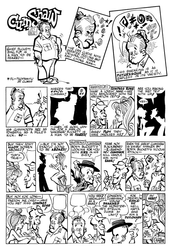 Sunday-style comic strip for the ship’s monthly magazine. Its eponymous title, Cumshaw, referred to a widely accepted but officially forbidden practice of