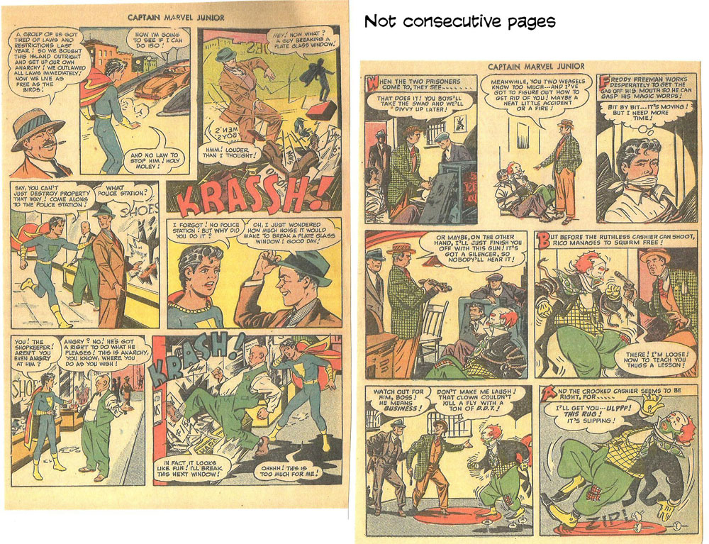 The Blue Boy Chronicles is editor/publisher Don Ensign’s (donensign @ mail.com) new fanzine that celebrates Fawcett’s Blue Cheese—namely, the crippled newsboy Freddie Freeman, who, by saying “Captain Marvel,” could transmorgrify himself into Captain Marvel Jr., attired in blue tights, not red. (Captain Marvel, Jr. is also the only comics character who could not introduce himself to anyone by name: the second he started saying his name, lightning would strike, and he’d be Freddie again.) The first (and so far, the only) issue of Blue Boy traces the “publishing history of Captain Marvel Jr.” and various other aspects of the character and his encounters. Captain Marvel Jr. was created by Ed “France” Herron; Mac Raboy designed the visuals. He debuted in Whiz Comics No. 25, December 1941, a scant two years after the Big Red Cheese (the Captain Marvel) bowed on stage. Raboy, who is usually shamelessly worshipped as the definitive CMJ. artist, lasted at the job only a little over two years, leaving sometime in 1944, Ensign tells us. His longest-termed successors included Al Carreno, Joe Certa, and Kurt Schaffenberger, but the one who drew the most CMJ stories was Bud Thompson, who started in late 1944 or early 1945 and produced “more CMJ story art than any other artist during the Golden Age,” says Ensign. I’m delighted to at last have encountered someone else who thinks Thompson’s art was superior to all others. But I’m astonished to learn that he produced so much CMJ art: I’ve tried for years to round up as many of the CMJ books he drew as I can find, and it turns out to be difficult to find them. If he produced so much, how come they’re so scarce? Here are some Thompson samples. He drew CMJ as a lithe youth (trying saying those two words together fast), but as much appeal as that rendering has, I admire his manner whatever he’s drawing—the languid flow of his liquid line, flexing only slightly; and he typically ticked parts of his pictures with delicate etching lines, imbuing his delineations with high contrast linework.