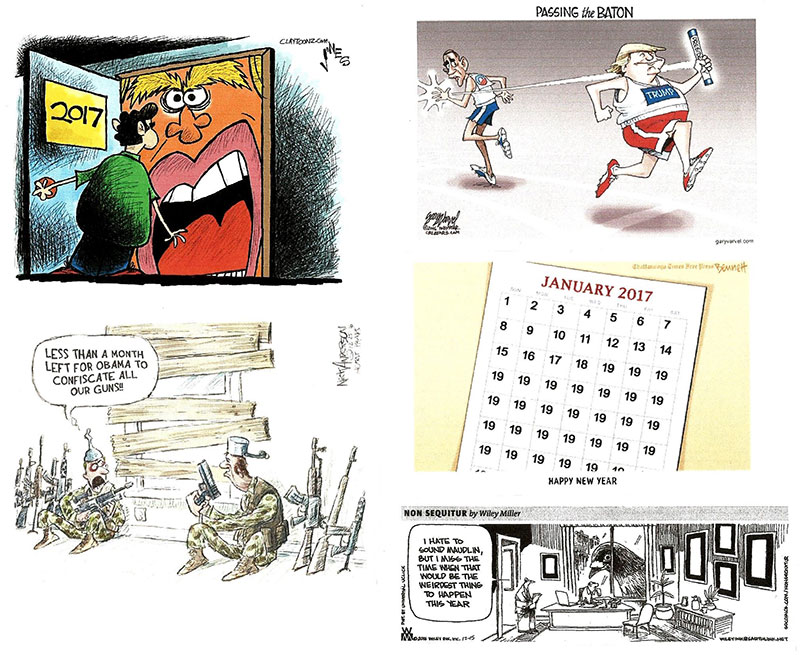 Trump New Year. And Clay Jones gets us off on the right foot at the upper left: opening the door on 2017, we can see little else but the orange-faced knit-haired nincompoop, blaring his fake truths in our face every day, 140 characters at a twitter time. Next around the clock, Gary Varvel’s picture of the presidential race’s conclusion—with Trump snatching the baton from Obama (the relay race with the baton is Obama’s metaphor for performing the presidency); but, you’ll notice, Trump is running in the opposite direction from Obama (i.e., into the Past). Clay Bennett expresses his dismay visually with a calendar of hope that delays forever the January 20 swearing in of “President” Trump. And at the bottom of the page, Wiley Miller, once an editoonist himself, declares the past year—the White House Race Year—a colossally weird year. Then, shifting focus for the last cartoon at the lower left, Nick Anderson takes a shot at the irrational fanatic weirdos who constitute the Gun Lobby with an image that captures their forever paranoia. Reaction