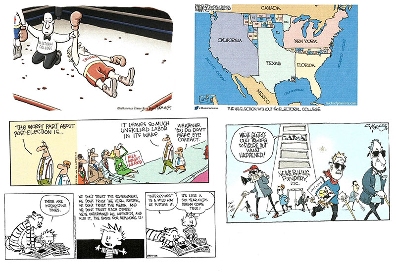 to the election of the Trumpet informs our next visual aid. Wiley Miller is back with another metaphor for the outcome of the Election. I suspect that there’s a typo in the speech balloon— ship for shit, and vice versa. And below that, Signe Wilkinson offers an Olympic winners platform image of the Electoral College at work, presenting the winner’s bouquet to the second-place Trump. The image persuasively discredits the Electoral College by comparing it to another competition. At the lower right, Chris Britt provides a portrait of those who actually won in the Election—bigots and nut cases all. Finally, Matt Davies draws attention to the salient fact of the Election: Trump lost the popular vote. Trump won by only the 100,000 votes accumulated in three swing states, Pennsylvania, Michigan, and Wisconsin. That was enough to garner the Electoral College victory. But he lost the popular vote by almost 3 million votes. And yet he’s behaving as if he has a landslide mandate—that is, as if his winning total was overwhelmingly greater than Hillary’s. Which, of course, it isn’t. It’s merely 100,000 winning votes as against a loss by nearly 3 million. Geez: what a system we have, rigged from start to finish. I’m about to launch into one of my periodic tirades, and if you’d like to skip it, you can scroll down to the next paragraph that begins with ALL CAPITAL LETTERS. Otherwise, forge on. Congressman and civil rights hero John Lewis expressed his doubts about the “legitimacy” of the Trumpet’s election—because, Lewis explained, of the evidence that Russian hacked Democratic Party computers and arranged for vast quantities of dubiously phrased e-mails to be released to the public, tainting Hillary’s reputation. Or, more accurately, the reputations of some on her campaign staff. These ostensibly private e-mail conversations revealed that some Democrats were not pure in their motivations. And this revelation had the effect of sabotaging Hillary’s campaign. How sabotage? Those revelations—coupled to the re-emerging FBI investigation announcement—doubtless confirmed in the minds of many would be Democratic voters who weren’t too keen on Hillary to begin with that she wasn’t worth their vote. They just didn’t want to vote for a person of such questionable character. They stayed home. I strenuously doubt that there was any outright ballot box tampering. But the Democratic turnout was low. Particularly in those three states I mentioned. If the turnout had been more enthusiastic, might Hillary have won in those states—securing, thereby, their votes in the Electoral College and, hence, a victory in the election? Maybe. Here are those three states again, the number of electoral votes each has, and the number of votes Hillary lost by: Pennsylvania, 20 electoral votes; Hillary lost by 44,312 votes. Michigan and Wisconsin each have 10 electoral votes. Hillary lost by merely 10,704 votes in Michigan; 22,177 in Wisconsin. She was 38 electoral votes shy of winning. If she’d won those three states, she’d have collected their combined 46 electoral votes—and she’d have won the election. So when Lewis says the TrumpTwit isn’t a legitimate winner because of Russian hacking (that may have persuaded some otherwise Democratic voters to stay home), we can see how he might believe that. If the hacked information took the wind out of Hillary’s sails and consequently shorted her some votes (let’s say 77,193 of them), Russia may indeed be responsible for the TrumpTwit’s election, hence his illegitimacy. But other matters lurk. This was the first presidential election in 50 years without the full protection of the Voting Rights Act, crucial parts of which were eviscerated by the Supreme Court a few years ago. “Partly as a consequence,” Ari Berman in The Nation (December 5-12), “14 states had new voting restrictions in effect for the first time for this election—including important swing states like Wisconsin and Ohio. “On Election Day, there were 868 fewer polling places in states with a long history of voting discrimination, like Arizona, Texas and North Carolina. These changes impacted hundreds of thousands of voters, yet received almost no coverage in the media. In North Carolina ... black turnout decreased 16 percent during the first week of early voting because ‘in 40 heavily black counties, there were 158 fewer early polling places.’” I don’t want to make a federal case out of this situation, but Berman is worth listening to on Wisconsin: “We’ll never know how many people were kept from the polls by these restrictions, but in states like Wisconsin, they had at least some impact on the outcome. Trump carried the state by 27,000 votes [or 22,000, depending], but 300,000 registered voters, according to a federal court, lacked the required forms of voter ID. Turnout in Wisconsin was at the lowest level in 20 years and fell by 52,000 in Milwaukee, where 70 percent of the state’s African American population lives. “‘We saw some of the greatest declines in the districts we projected would have the most trouble with voter ID requirements,’ Neil Albrecht, executive director of the city’s Election Commission, told the Milwaukee Journal Sentinel.” Maybe the new restrictions in Wisconsin didn’t cost Hillary the election in that state. Or in Ohio? Or Pennsylvania? We clearly can’t say. But there are enough Russians and voter restrictions to support Lewis’ contention that the Trumpet isn’t a legitimate Prez. Some other statistics from the Election: 47% of eligible voters didn’t bother to go to the polls; of 130-plus million ballots cast, Trump got only 62.9 million, about 25% of the electorate; 65.8 million voted for Hillary, beating the Trumpet by almost 3 million votes; 60% of those who voted for Trump said they don’t trust him. Some of the stats are more encouraging. Raising the minimum wage seems to be popular: all four states