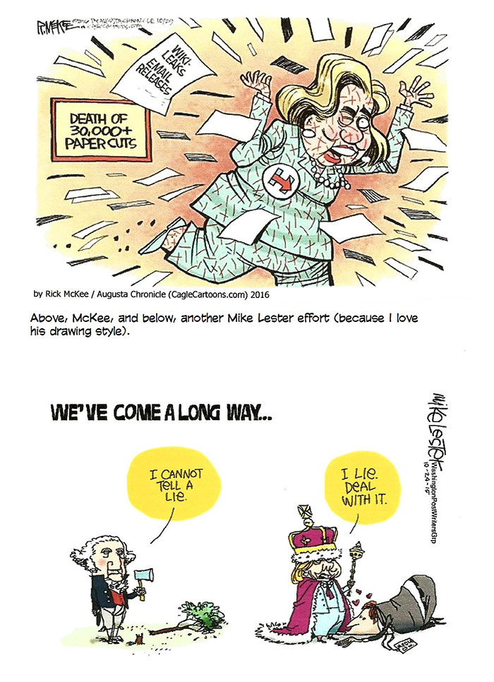 Rick McKee (Augusta Chronicle): It’s a toss-up. Trump would be so much fun because he’s a walking cartoon character, from his looks to his mannerisms to his willingness to say the looniest stuff. He would be an endless source of material. A President Hillary would be so wonderful for a conservative cartoonist like myself, because she’s such a scandal machine. Most cartoonists tend to skew left, so they might not be as willing to go after Hillary with the same gusto. You toss Bill in the mix and you’ve got the recipe for cartoonist heaven. “Either way,” Cavna finished, “— cartoonists win!”