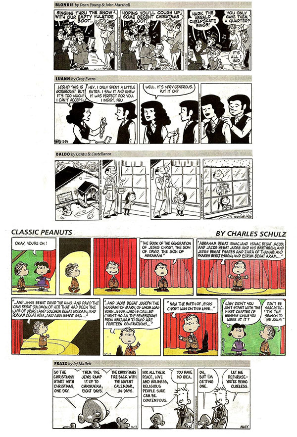 before—a colorless Saturday—some strips were getting ready. In Greg Evans’ Luann, Leslie the moper gives Prudence a necklace as a Christmas present. Does he have romantic hopes? But she’s a lesbian, right? So is Evans going to give us a glimpse of another kind of human dilemma? How does a lesbian escape male attentions? We’ll see. Hector Cantu and Carlos Castellanos offer a scene in Baldo that while not Christmas exactly becomes holiday-ish by occurring on December 24. No joke, no gag. No belly laughs. Just a father and his daughter and a peaceful moment. Worth a warming chuckle, surely. Classic Peanuts reprises another of Linus’ Christmas messages. This undoubtedly appeared in the funnies section long after Linus’ stunning conclusion to tv’s “A Charlie Brown Christmas.” The Frazz strip is a week old, but it contemplates the holiday. And Jef Mallett also makes a comment on the religiosity of religions. Or is he taking the opposite view?