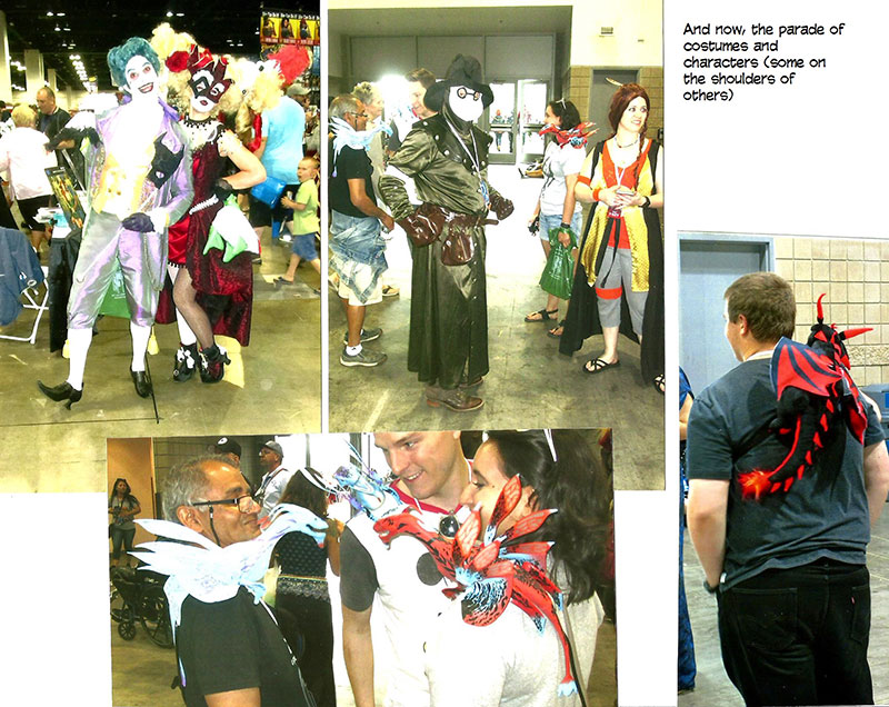 The people who paused at my table were not from the usual comic-con crowd of geeks looking to get a selfie with some Hollywood celebrity or comic book legend (like Kevin Eastman, who had an island of a booth for the purpose). Geeks don’t generally go for history books like mine. My books have words as well as pictures in them, so those who stopped to thumb them were, at least, readers. Advance ticket sales predicted that attendance this year would again reach 115,000 or more, to which can be added about 200 special guests, tv and movie actors and Hollywoodian and other celebrities (among them, Garfield’s Jim Davis, Dark Knight’s Frank Miller), selling autographs at stellar prices at Celebrity Summit (a vast corner of the exhibit hall where long lines could form). In 25 session rooms in the caverns below the exhibit hall, 750 hours of programming take place with celebrity Q&A, workshops and demonstrations. I didn’t attend any of them: I’m too deaf to hear what stellar speakers are saying at head tables. On the exhibit floor, 10,000 square feet are devoted to Kids Lab, where youngsters participate in special activities designed to stimulate creativity. The Denver Comic Con differs from most of the breed because it is sponsored and operated by a non-profit entity, Pop Culture Classroom. The Con (this year, the seventh) costs about $2 million to produce but generates a revenue above the cost. The profit is turned over to Pop Culture Classroom, which uses it to produce “high quality, all-inclusive educational resources and programs to school districts, teachers, and community organizations using comics, graphic novels, games, costuming and other pop culture media.” The Con took place on the same weekend as PrideFest was sponsoring a parade and parties. Neither event seemed to interfere with the other, but in the streets outside the Con, it was hard to tell from the throngs in costume which event people were fugitives from. The rest of this report is visual, photos I took whilst whiling away the hours. Enjoy the browsing (and some of the photos are accompanied by revealing captions; don’t miss ‘em if you can).