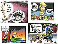 Sessions stars in the next display. Being strong, the Trumpet says, is key to having a country. You can’t have a country without effective borders. And he has, indeed, as Tom Toles shows us, amply demonstrated what “appearing” to be strong consists of: kicking little kids. Ah, what power. What strength. Joel Pett at the lower left compares Spanky’s dreams to the ones he’s so far shattered, deploying the comic strip form to list the Trumpet’s dreams/accomplishments. The last panel is the switch in this bait-and-switch: we aren’t expecting Trump’s nightmarish accomplishments to be termed (as he does) “dreams.” Returning