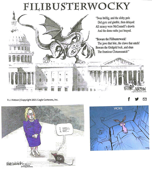 Opus 424a (January 13, 2022): Having frittered away several light years of the time allotted to Rants & Raves on the Web last time—I mean, I wrote so much that the boundaries of the usual Rancid Raves had swollen beyond reason—that is, I’d produced more than I could expect even the most fevered follower to read at a single sitting—I trimmed the content to a more digestible dimension by cutting out almost all of the Editoonery Department, promising at the same time to post it all within a week. And so here we are with the promised resurrection of those editorial cartoons. We’ve also added some newsy bits here at the beginning, but most of this posting is editoons. Onward—: