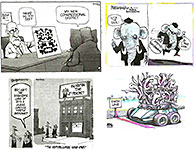 out; sorry). Steve Sack seizes the occasion to draw attention to the tons of plastic swirling around in mid-Pacific. Then we’re back to politics as usual, which, in Phil Hands’ hands, consists of a circular formation in which everyone blames everyone else for whatever predicament we’re in. Next we have Lee Judge’s sharp-cornered creations again, images of the GOPachyderm going from one controversy to another (rather than enacting any legislation). The