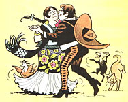caught, and I had to go with what I had created.” He gave Gordo a shave and slowly eliminated the pidgin lingo the characters all spoke. But that was only the beginning of the strip’s transformation. In the spring of 1959, Arriola converted Gordo from bean farmer to tour guide. It was a brilliant maneuver: by this single stroke, the cartoonist had opened up a vast source of gags for the strip. Henceforth, he regaled American readers with many aspects of Mexican folklore, history, and art in an informative but always entertaining fashion. The strip doubtless introduced many of its readers to such things as pinatas, frijoles and burritos not to mention a host of Spanish terms— amigo, adios, compadre, and so on.