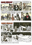 lagged behind. "And the readers themselves urged me on. At first the strip was something of an anachronism. It dealt with the twentieth century intruding upon this sleepy little Montana town. But the readers tended to want their West to be the Old West. And I kept hearing that, and finally, I thought to myself, That's what I want too. So in the late sixties I adopted a centennial theme: if it was 1969, it was 1869 in the strip. And I kept that going. "Once we were in the Old West," he continued, "I felt I had to be authentic about it. Again back to Russell: Russell sort of set the standard. Painters of the West today are locked into doing it very authentically; you don't find much successful impressionism of Western subjects. "It's almost as if the viewer wants authenticity in the detail," he said. "This goes even deeper. I had a friend from Ireland, who said he believed the West was our folk legend, similar to their knights of the round table or Robin Hood. And it certainly is the thing that is recognizable in Europe and elsewhere about the U.S. There's something about the space and the freedom that we had as a people that I think finds its expression in the Western, that frontier spirit and feeling." I agreed: "I have said on many occasions that the Western—whether it's about a cowboy or a gunfighter or Marshal Earp—whatever it is, it's the American mythology, and those characters are the archetypal Americans. And in fact, I've even tried to make a case for superhero comic books simply being another manifestation of the same thing. And if you think about it, they really are: the classic Western story has to do with an individual who's posing his sense of right and wrong against what's around him, and he really is a vigilante--just like the superheroes always are." "That's exactly right," Lynde said. "It has been pointed out that Star Wars, for instance, was definitely a Western, a very very good adaptation." He continued: "I think one of the great evidences of the vitality of the Western is what people have done to it. How it has been corrupted and abused, how it survives the debunkers who periodically rise up and revise history. They've done it with the gunfighter myth and with the Indian myth. This year it's popular to do it with Christopher Columbus and the early explorers. But it survives all that. It survives bad Western movies by Hollywood. "One of my frustrations has always been that the prevailing wisdom on the part of newspaper editors or TV or movie people—or whoever, or syndicates—is that Westerns don't work. Then we get a good one like Lonesome Dove, and everyone says, Well, yeah—Hey, that works. And then they do some more Westerns and they do a bad one or two, and they don't work, and they go back and say, Westerns don't work. That stuff doesn't work. Well, Westerns do work if you do them right and authentically." Clint Eastwood's Unforgiven was one of those successful Westerns. And it was influenced by Rick O'Shay. Michael Price, movie critic of the Fort Worth Star Telegram, made the observation in his review of the film: "The very mentors to whose memories Eastwood has dedicated Unforgiven, Don Siegel [The Shootist among others] and Sergio Leone [Fistful of Dollars, etc.], had long ago acknowledge the funny papers' Rick O'Shay as an influence." Lynde noted one striking similarity: "There was one scene in The Unforgiven where the Eastwood character was shooting at a tin can and missing and finally goes back for his shotgun, which came from a Sunday page I'd done in Rick. In fact, I'd done it a couple times, with different punchlines. A friend suggested that I send one to Eastwood with a note saying, Saw Unforgiven--and I forgive you," he finished with a laugh. Lynde has done a great deal of research in producing his strips, including reading historical accounts and logbooks and personal diaries written during the period of his stories. Said he: "I've had cartoonists ask me why I go to all the work of making sure that all the detail is totally authentic and accurate. And my answer has always been that I feel there's something about doing it as authentically as I can that will communicate to people, even those who don't know. For example, when I read the sea stories of Melville or Dana, I don't know anything about the sea, but I'm always given the impression that, This is right. And I think that comes through." I observed that his passion for authenticity goes beyond the visuals: "Even the language, the way the characters talk, sounds authentic," I said. "I have no way of knowing whether it is authentic. But it certainly doesn't sound like Hollywood cowboys: it sounds like real cowboys." "Well, I appreciate that," Lynde said. "I hope that's true. Cowboys were colorful talkers. They certainly were. They may not have been altogether literate, as far as reading was concerned, but they had mastered their language. You'll find a lot of exactly what we're talking about in a book called Trails Plowed Under. It's a book of stories by Charlie Russell, told in dialect or by a ‘character.' They're wonderful. Russell's stories are perhaps almost as good as his art." I said, "I ran across an expression in one of your novels—someone who didn't have `enough clothes to pad a crutch.'" "Yes," Lynde laughed. "That's from Charlie Russell. Really descriptive. It's the kind of thing the old timers did a lot of." We talked about his characters. I asked: "To what extent do you feel that the characters are whispering in your ear about what they're going to do next?" "That's a pretty strong feeling," he said. "I often think of them as actors, and they have to negotiate for billing and what have you. Once a fan who had stayed with me for a long time wrote to me upset and said Hipshot wouldn't have done that—whatever particular thing it was. He knew Hipshot and he knew Hipshot wouldn't have done that. And I thought, All right, it's that real to them." "But the characters are real to y