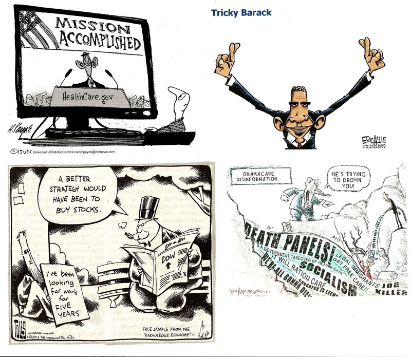 slaughter. The so-called news media (echoed by trumpeting Pachyderms on all sides) endlessly repeated Obama’s “lie,” and all the snipers conveniently overlooked at least eight Donkey senators (including Mary Landrieu and Mark Udall) and half-a-dozen (at least) House members (including Democrat leader Nancy Pelosi) who said exactly the same thing that Obama said. They escaped; Obama did not. Payne and Allie are both of the conservative (i.e., ragingly hostile) persuasion, but their imagery is powerful and memorable. Still, as usual, I have the last word. PolitiFact, a nonpartisan fact-checking operation run out of the Tampa Bay Times, awarded Obama’s oft-repeated utterance the “lie of the year” designation. By clear implication, the Prez was Liar of the Year. The previous year, Mitt Romney won the nod for best mendacity for saying that Jeep was moving its factories to China. Calling the sitting President of the U.S. “liar of the year” is a serious matter, and it deserves more investigation than our pundit news media are capable of giving it. So I’ll try here. (With what many will say is a predictable outcome; but let’s see.) On the bare face of the facts most often deployed, Obama was clearly lying. But “lying,” almost by definition, involves deliberately telling untruths. Was Obama deliberately lying? His apologists think not. (And I agree. There. The predictable part is over.) Greg Diamond at Orange County’s “Political Mosh Pit”—Orange Juice Blog—reports that in the Los Angeles Times, columnist David Lazarus “assesses the question of whether President Obama deliberately misled the public about their ability to keep their current health insurance. The verdict: pretty much ‘no’ – and certainly not with intent to deceive. In talking to the public, he didn’t always repeat the qualifications that had been built into the bill at the time that the legislation was passed, but that’s a far cry from lying. “If you want to see Presidential lying,” Diamond goes on, “I have a long list of lies from the Bush Jr. administration lying around here somewhere – starting with the justification for Iraq War. That was a consequential lie — or series of lies, actually. And if you want to see a recent list of lies, I’m sure I can dig up a long list of accusations leveled by Darrell Issa and others — including some in these very electronic pages. (Fast and Furious and Benghazi, anyone?)” When Obama said “If you like your medical insurance, you can keep your medical insurance,” he should have added: “provided the insurance company continues to offer it and provided that the insurance offered meets the minimum standards demanded by Obamacare” (which qualification was always in the law and was reported on in the news of the day with reasonable frequency before the law was passed). But Obama didn’t add that. He did early on in more elaborate pitches for the Affordable Care Act; but as time went on, he shortened the pitch and reduced it to a catch phrase, which, abridging the explanation, wasn’t the whole truth. Lazarus continued: “So, yes, the president wasn’t as clear as he should have been. You can call him a liar if you want. But I see a clear difference between not offering the full story and making stuff up out of whole cloth. “I mean, it’s not as if he publicly insisted that so-called death panels would decide people’s medical treatment, or that most small businesses would be crippled by the reform law or that the government is taking over the entire healthcare system. “That’s what his critics have been saying. Those are some serious lies.” All of which factoids Nick Anderson reminds us about in his cartoon, next around the clock. Compared to the image of Obama squirting a paltry stream of misrepresentation, the GOP’s endless torrent of falsehood is a virtual flood of lies, all of which are listed in the deluge. Finally, although joblessness wasn’t any bigger a story this year than for the last five years, I’m concluding this survey with Tom Toles’ wonderfully ironic imagery which, with a single swell foop, captures the GOP’s insouciant ignoring of the facts of life as faced by the less fortunate multitudes who have been decimated by the policies, in both the fiscal and the military conquest realms, of the Republicons, who insisted on invading Afghanistan and Iraq but refused to pay for the campaign. Toles provides a suitably bitter but hilarious note upon which to conclude our Bunny Bonus. We’ll take up other year-end matters in our next opus before the end of the month. Meanwhile, stay ’tooned.