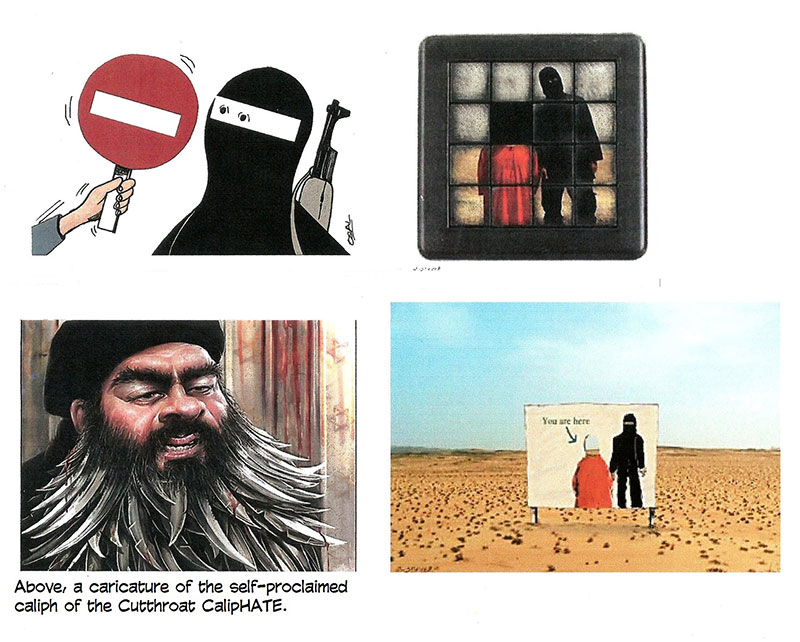 IRAN STEPS IN Meanwhile, Iran is running an anti-Isis cartoon competition, reported independent.co.uk, “inviting submissions from around the world that mock the militant group and the atrocities it has committed. “Mohammad Habibi, the executive secretary of the contest, said 280 works had been selected from 800 submissions, including entries from over 40 countries such as Brazil, Australia and Indonesia. Habibi told the Tehran Times that some foreign cartoonists were attending the contest, but that they had been forced to travel under pseudonyms due to security concerns.” He